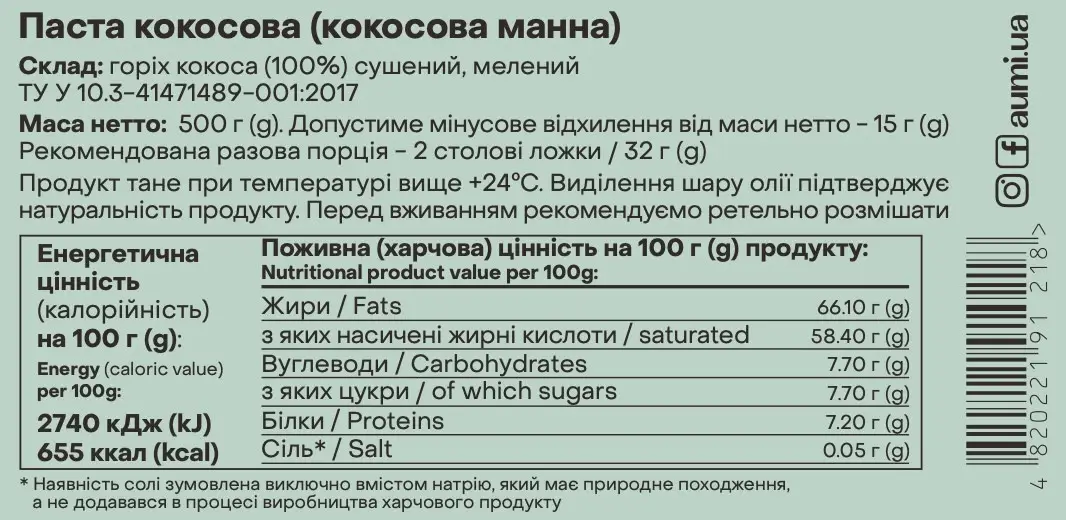 “Natural coconut paste is ground in a specially designed mill at low speed at a temperature not exceeding 48’C. Dried coconut pulp of the highest grade with a maximum fat content of 65% is used for production. Unlike coconut oil, the paste contains both coconut oil itself and all the fiber, proteins, carbohydrates, minerals and vitamins.